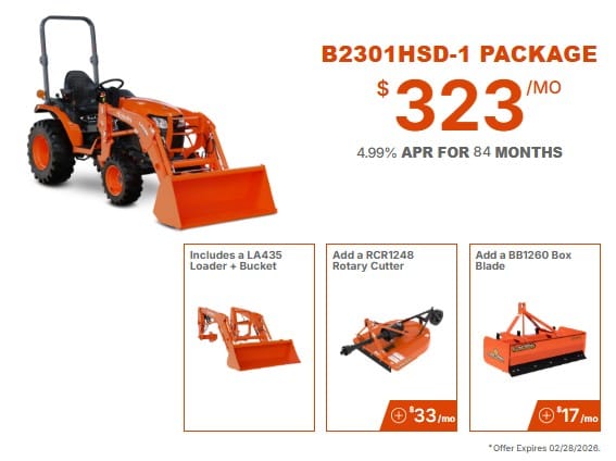 Monthly payment shown is based on no money down with 4.99% APR for 84 months. Insurance is included in the estimate; however, taxes and applicable fees are not included and may vary based on individual circumstances. Financing is subject to approved credit. Offer valid on in-stock units only. Promotion expires 2/28/2026, but is subject to change without notice. For complete details, visit your local dealer or KubotaUSA.