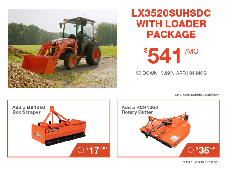 DISCLAIMER – $0 Down, 5.99 % A.P.R. financing for up to 84 months on purchases of new Kubota LX Series equipment from participating dealers’ in-stock inventory is available to qualified purchasers through Kubota Credit Corporation, U.S.A.; subject to credit approval. Example: 84 monthly payments of $14.60 per $1,000 financed. Customer instant rebate of up to $4,500 with cash or standard rate financing on Kubota LX Series Equipment. Customer Instant Rebate is not available with 0% A.P.R. or other promotional financing. Offers expire 12/31/25. Terms subject to change. Taxes and insurance are not included. For complete warranty, disclaimer, safety, incentive offer and product information, consult your Dealer or KubotaUSA.com.